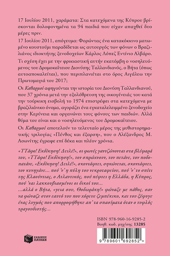 17 Ιουλίου 2011, χαράματα: Στα κατεχόμενα της Κύπρου βρίσκονται δολοφονημένα τα 94 παιδιά που είχαν απαχθεί δυο μέρες πριν. 17 Ιουλίου 2011, απόγευμα: Φορώντας ένα κατακόκκινο ματωμένο κουστούμι παραδίδεται ως αυτουργός των φόνων ο Βραζιλιάνος ιδιοκτήτης ξενοδοχείων Κάρλος Λόπεζ Εντίνιο Αλβάρο. Τι σχέση έχει με την φρικιαστική αυτήν εκατόμβη ο νοσηλευόμενος του Δρομοκαΐτειου Διονύσης Ταλλανδιανός, ο Βήτα (όπως αυτοαποκαλείται), που περιπλανιέται στο όρος Αιγάλεω την Πρωτομαγιά του 2017; Οι Καθαρμοί αφηγούνται την ιστορία του Διονύση Ταλλανδιανού, που 37 χρόνια μετά την εξολόθρευση της οικογένειάς του κατά την τούρκικη εισβολή το 1974 επιστρέφει στα κατεχόμενα με βραζιλιάνικο όνομα, αγοράζει ένα εγκαταλελειμμένο ξενοδοχείο στην Κερύνεια και οργανώνει τους φόνους των παιδιών. Αλλά θύμα του είναι και ο νοσηλευόμενος του Δρομοκαΐτειου. Οι Καθαρμοί αποτελούν το τελευταίο μέρος της μυθιστορηματικής τριλογίας «Πένθος και έξαρση», που ο Αλέξανδρος Μ. Ασωνίτης έγραφε επί δέκα και πλέον χρόνια. «ΤΤάφο! Εκδίκηση! Δειλέ!», οι φωνές γαντζώνονται στα βλέφαρά του, «ΤΤάφο! Εκδίκηση!», τον σπρώχνουν, τον πετάνε, τον ποδοπατάνε, «Εκδίκηση! Δειλέ!», σκοντάφτει, σηκώνεται, σκοντάφτει, τον κυνηγάνε… πού ’ν’ η πύλη του νεκροταφείου, πού ’ν’ το σπίτι της Κλαούντιας, ο Ατλαντικός, πού πέφτει η Ελλάδα, η Κύπρος, πού ’ναι λακκουβιασμένοι οι δικοί του… …αλλά ο Βήτα, «γεια σου, Θοδωράκη!» φώναξε με πάθος, σαν να φώναζε στον εαυτό του που χόρευε ζεμπέκικο, και του ξέφυγε ένας λυγμός που απορροφήθηκε απ’ τα σπασίματα όταν ο τυφλός τραγουδιστής…