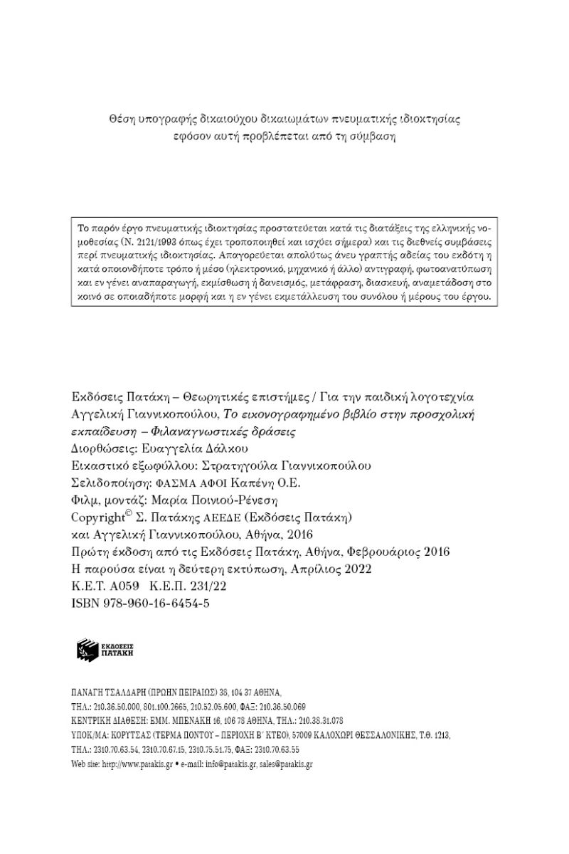 Το βιβλίο αυτό αποσκοπεί στη διατύπωση μιας σειράς διδακτικών προτάσεων, κατά βάση στο νηπιαγωγείο, για τον σχεδιασμό φιλαναγνωστικών δράσεων που όμως μπορούν να λάβουν χώρα και σε άλλες βαθμίδες της εκπαίδευσης, καθώς και σε βιβλιοθήκες ή στο σπίτι, εξασφαλίζοντας ποιοτικό χρόνο ανάμεσα σε παιδιά και γονείς. Χαρτογραφώντας αδρομερώς το εκδοτικό τοπίο, ελληνικό και διεθνές, το βιβλίο επιχειρεί να διατυπώσει προτάσεις που μεταφέρουν στην πράξη τα νεότερα πορίσματα της θεωρίας του εικονογραφημένου βιβλίου, της λογοτεχνικής κριτικής και της διδακτικής της λογοτεχνίας, ενώ μάχιμες νηπιαγωγοί και φοιτήτριες του ΤΕΑΠΗ, ΕΚΠΑ ανέλαβαν να τις εφαρμόσουν σε νηπιαγωγεία.